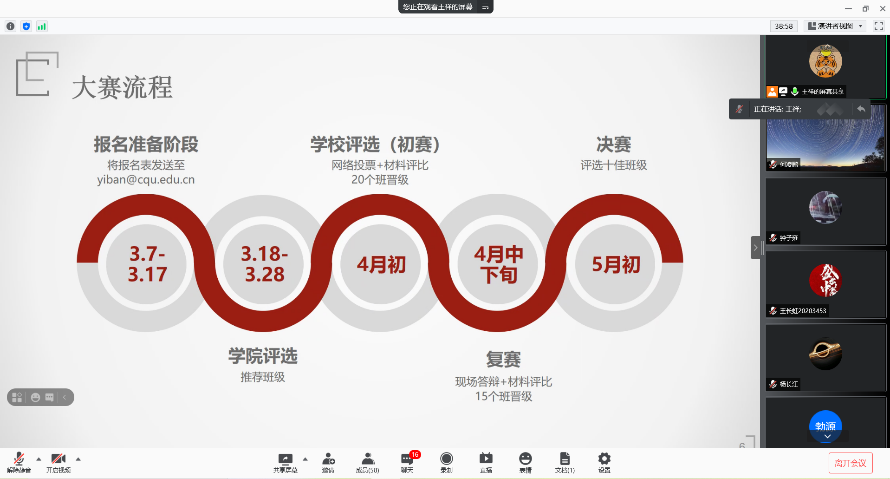 On March 15th, 2022, the 7th Top Ten Freshmen Class Competition of Chongqing University training activity was carried out online. The activity was presided over by instructor Wang Xiang, from the School of Electrical Engineering. Office staff and representatives of the registered classes attended the activity.